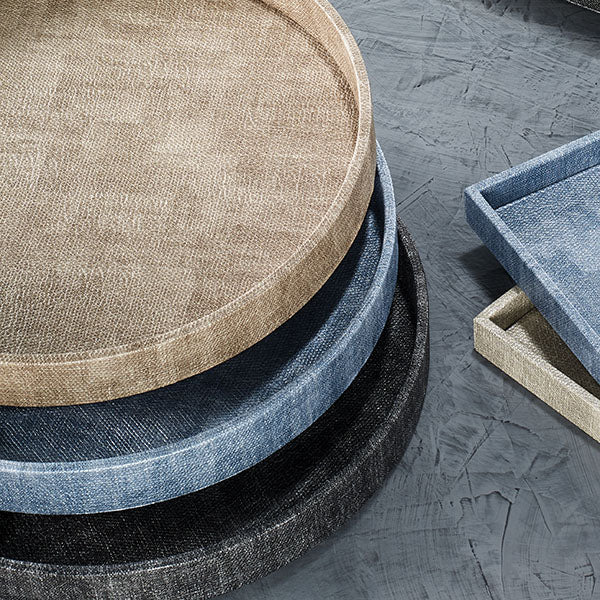 The Luster round serving tray combines practicality and elegance, crafted from the same easy-care fabric as the placemats. Their wipe-clean surface ensures quick maintenance, making them perfect for entertaining. Spacious enough to hold martinis or appetizers, these trays are an excellent addition to any gathering.