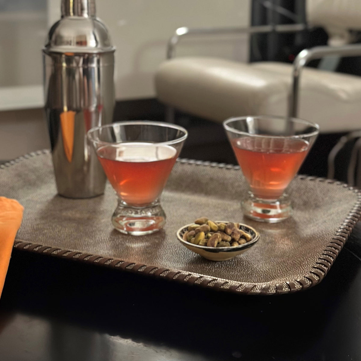 The Whipstitch serving trays bring a touch of style to any occasion, perfect for serving everything from coffee to cocktails or appetizers. Featuring a 100% leather whipstitch edge, they add a fun flare to your table setting.