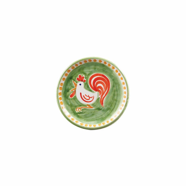 The Gallina Olive Oil Bowl, adorned with a whimsical handpainted rooster, brings a charming rustic touch to your table. Made from terra cotta and part of the Campagna collection, this bowl is perfect for serving olive oil or dipping sauces, adding the playful spirit of the Italian countryside to your dining experience.