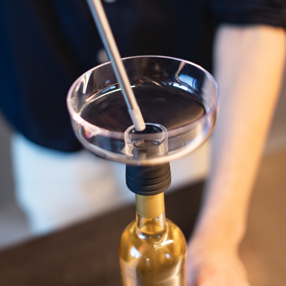 - Open your bottle of wine and place the "Loop" (funnel) on top. Attach the wand to the air pump and place in bottle, resting the wand on the bottom of the bottle.