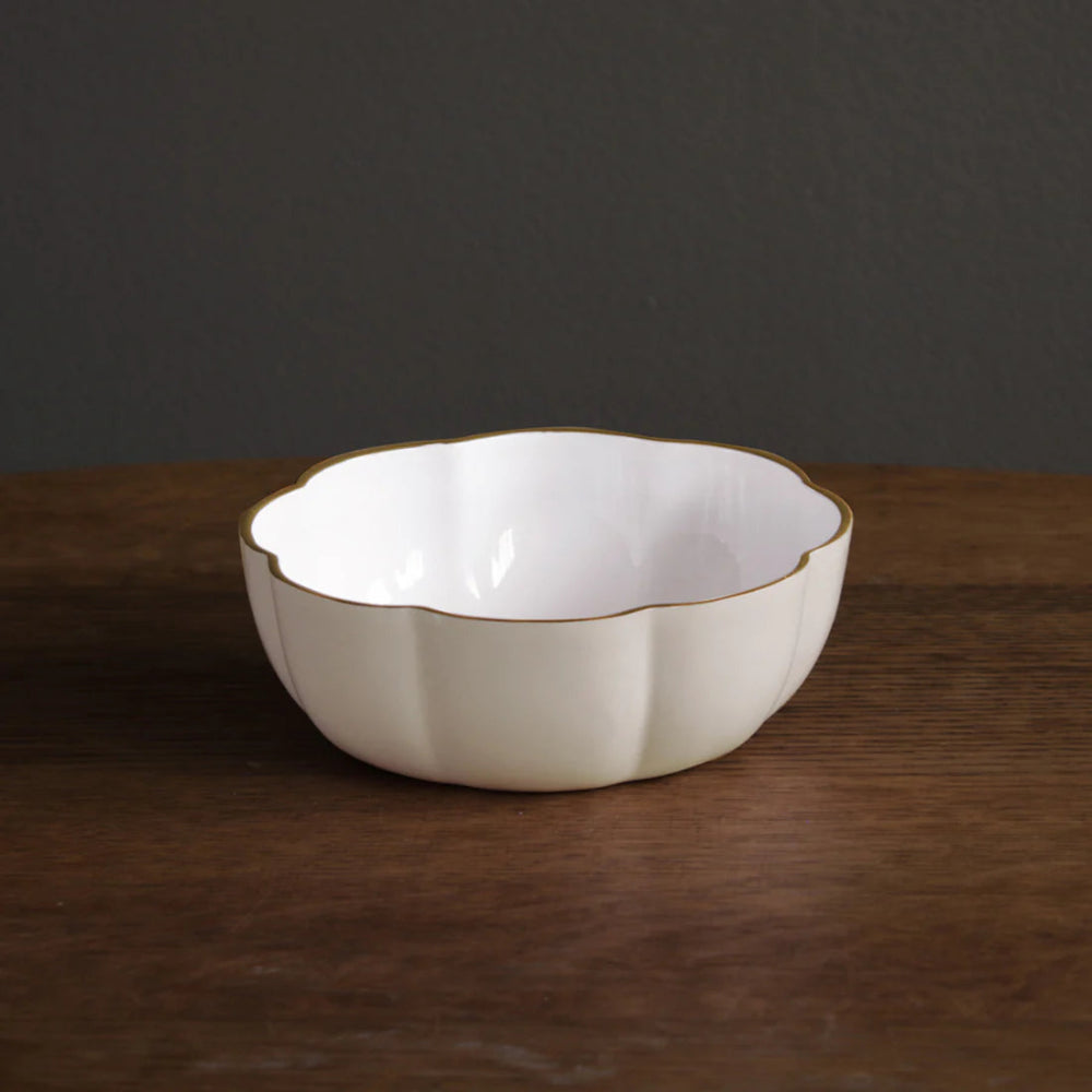 The Beatriz Ball Encanto Devon Cream and White Mini Bowl is a beautiful blend of timeless design and vibrant craftsmanship. With its scalloped shape, brilliant two-toned enameled finish, and gold-rimmed edges, this small yet versatile bowl adds a touch of elegance to any setting.
