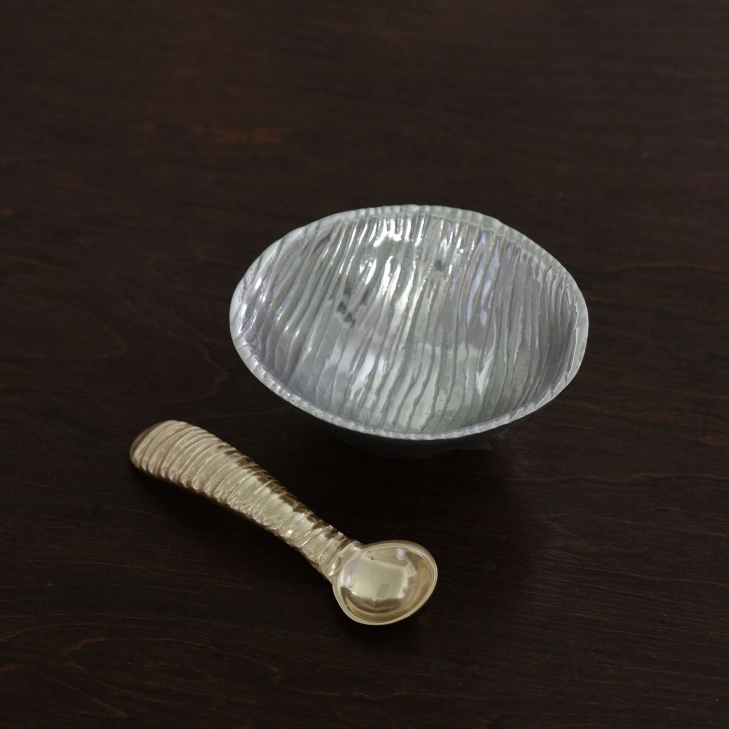 • Design: contrasting metal tones with deeply furrowed surfaces, featuring a gold bowl and gunmetal spoon