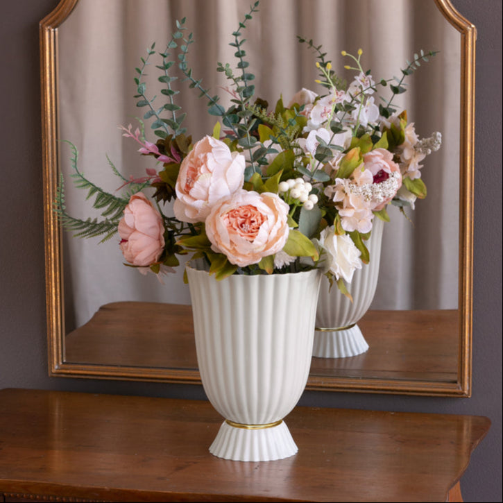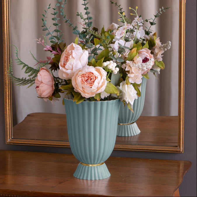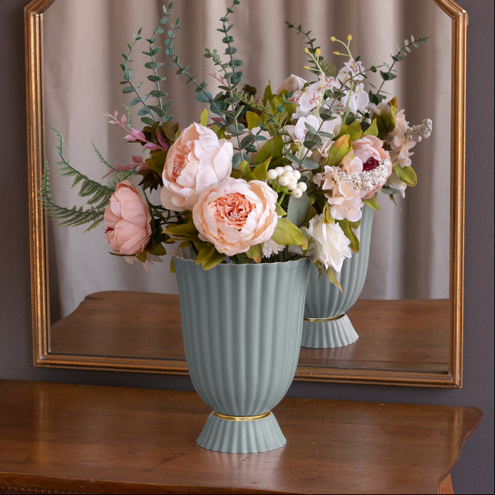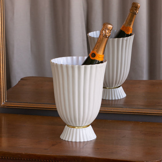The Beatriz Ball New Orleans Encanto Vienna Vase blends timeless elegance with modern charm, featuring fluted curves, a slate-toned enamel finish, and a striking gold accent. Both decorative and functional, it can be used as a vase or to chill a bottle of wine.