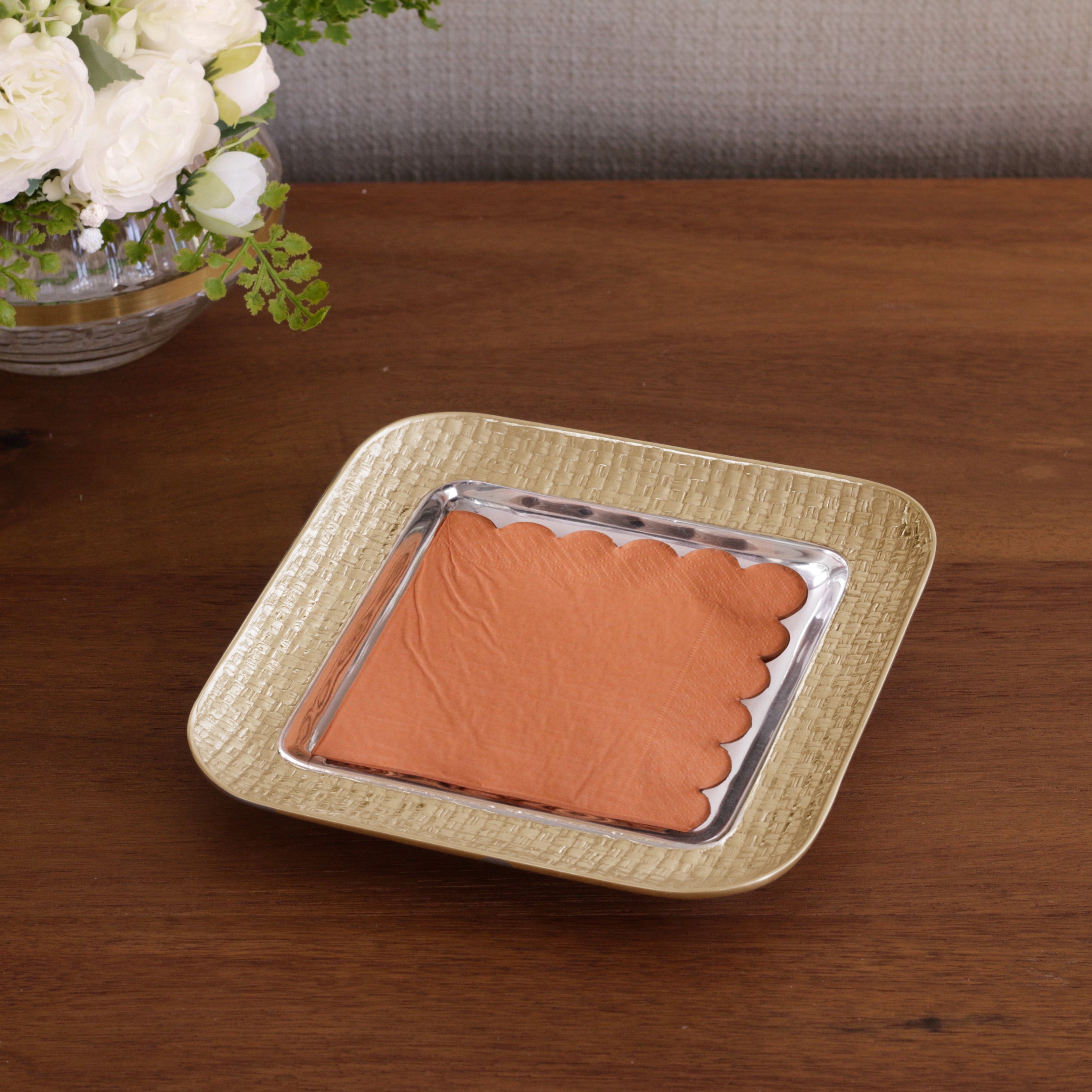 From the Sierra Modern Collection, a handsome napkin box in the Nassau style. The Sierra Modern Nassau Cocktail Napkin Holder (Silver and Gold) is beautifully finished on the inside and outside, and can be used to hold candies, nuts, perfume bottles, paperclips, keys, or even napkins.
