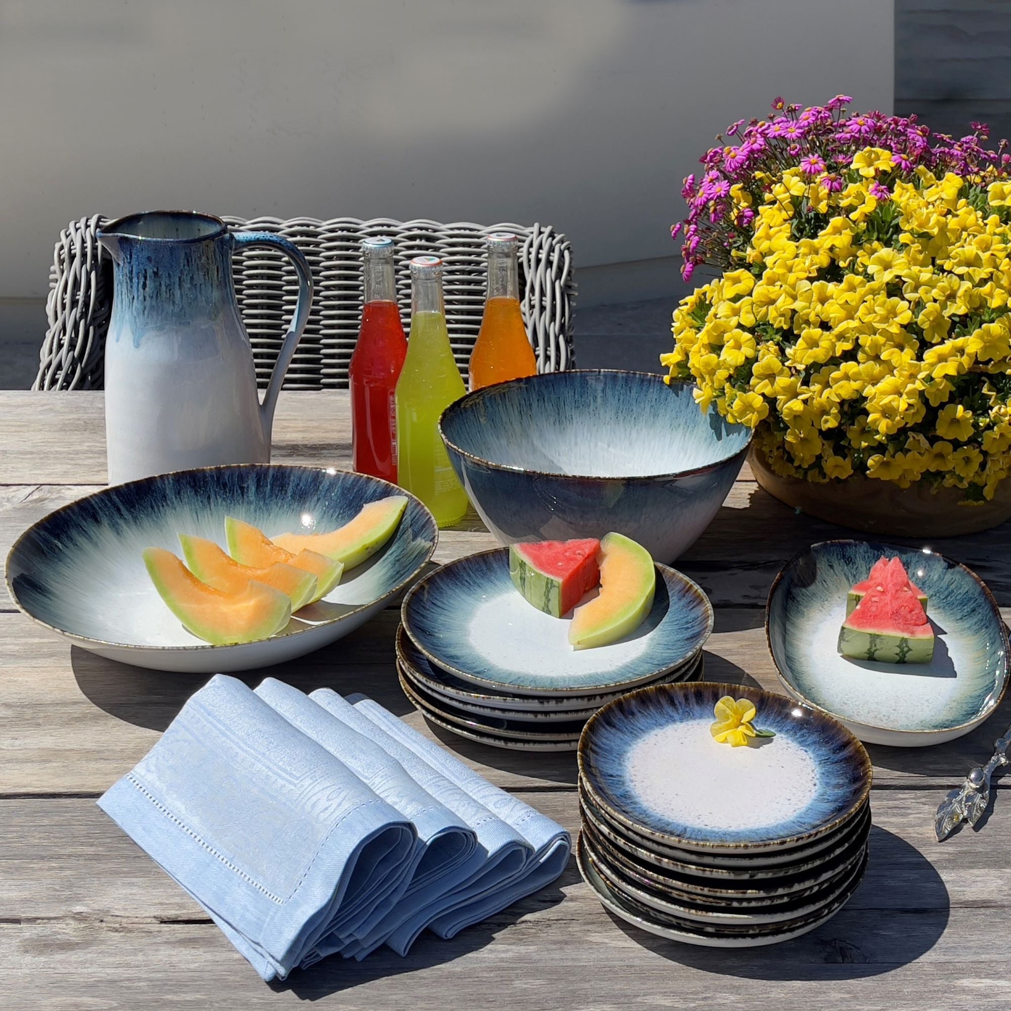 Cypress Grove adds a dramatic look to your home with the beauty of reactive glazes with stunning blues and browns. You'll want to use this centerpiece type bowl for a variety of purposes, such as holding fruit and serving the main course or side dishes. 10"D and about 5" deep. Microwave and dishwasher safe ceramic stoneware. Made in Portugal.