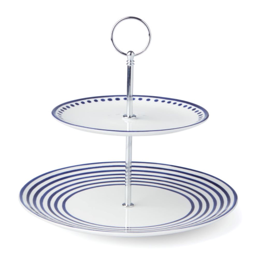 Invite style into your home with this spectacular 2-tiered serving plate. This charming piece features the iconic Charlotte Street pattern in delicate blue and white, adding coastal beauty to your kitchen or dining space. Step up your serving game with double the room for cakes, cookies, and sweets, and impress your guests with every presentation.