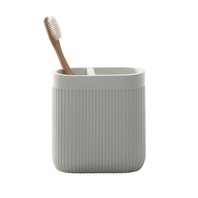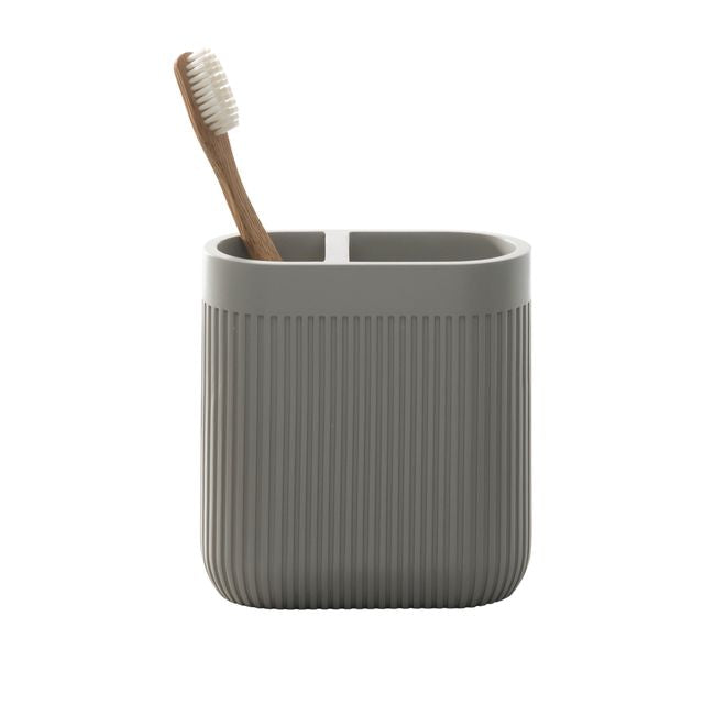 Sophisticated and functional, the Moda At Home Corbett Resin Toothbrush Holder brings sculptural elegance to your bathroom. Crafted from durable resin with a distinctive grooved texture, it features a divided interior to keep brushes upright and neatly separated. Its rounded shape fits effortlessly on your countertop, adding both style and organization to your space. Wipe clean with a damp cloth.