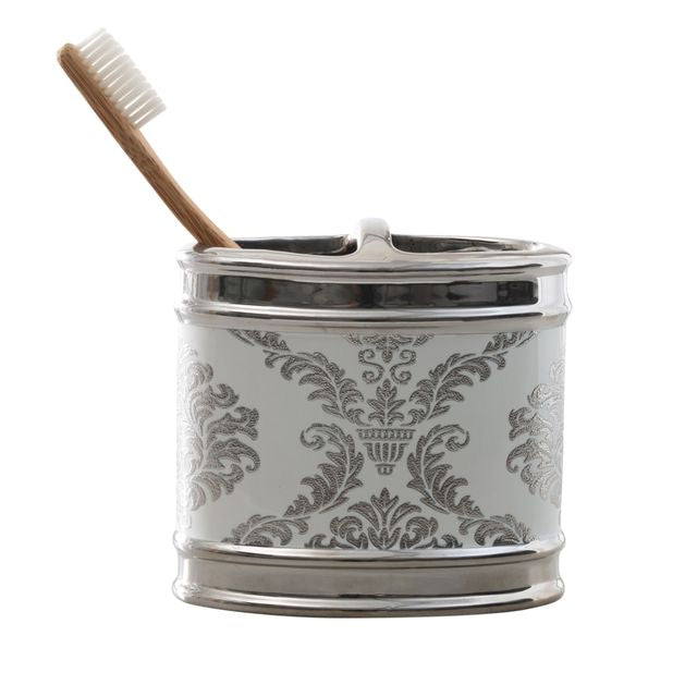 Moda At Home Damask White and Silver Ceramic Toothbrush Holder