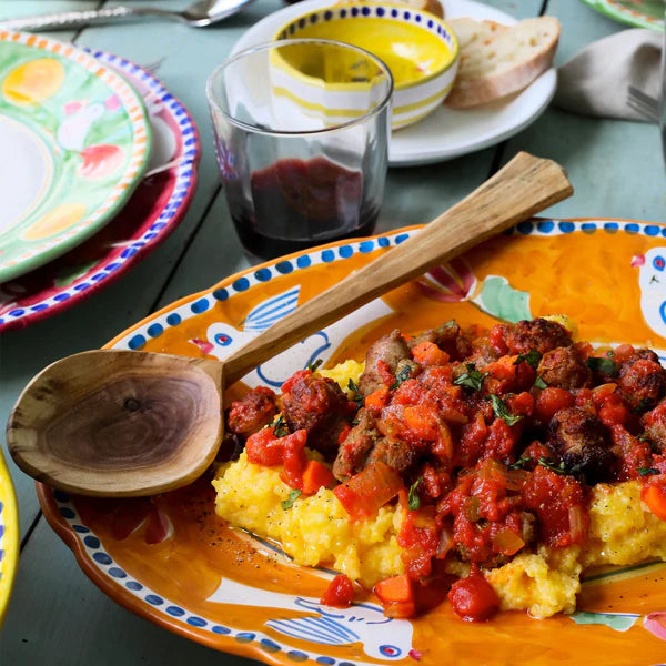The colorful orange and blue Campagna Uccello Oval Platter, made of terra cotta, features whimsical handpainted birds and flowers. Mix with other animals from the Campagna collection to create a fun table that captures the vitality of the Italian countryside!